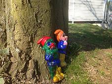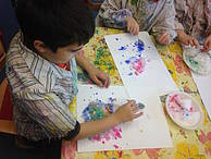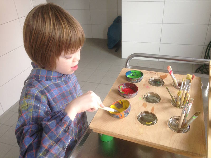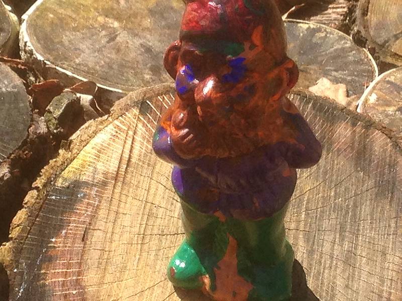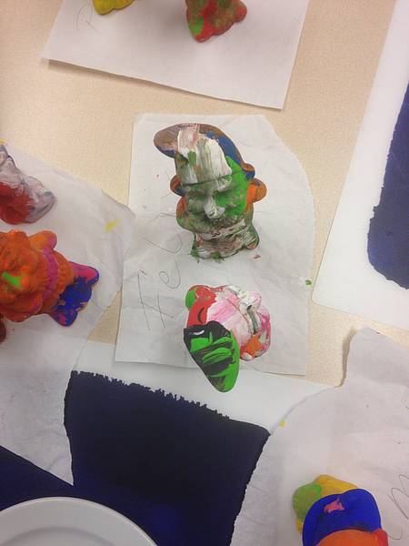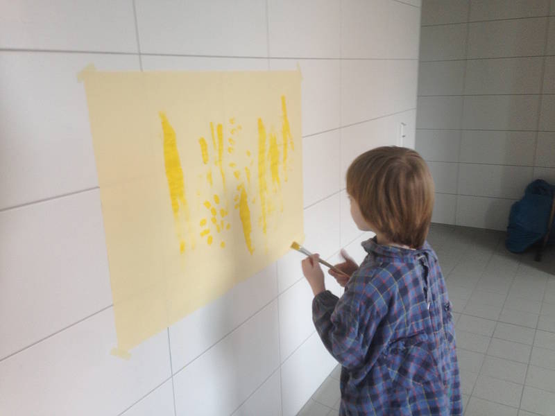 Nach den Halbjahresferien wurde die Gruppe geteilt. Die eine Hälfte durfte sich im Matschraum künstlerisch frei entfalten. Dabei wurde pro Schüler ein Plakat an der Wand befestigt, auf dem sie ihrer Kreativität freien Lauf lassen durften. Die andere Hälfte hat Gartenzwerge für den Schulhof angemalt und später lackiert. Dann wurde getauscht.