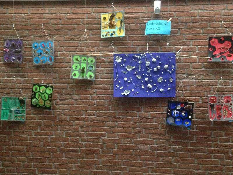 In den letzten AG-Stunden haben die Schüler Materialdruckbilder gestaltet (mit Schwämmen, Wattestäbchen, Korken uvm) und mit Schablonen und Farbrollen auf einem großen Blatt ein Gemeinschafts-Schablonenbild gestaltet. Am Schluss haben alle Schüler gemeinsam ausgewählt, welche Kunstwerke in einer Ausstellung präsentiert werden sollen.