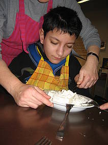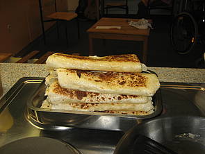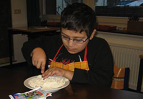 Hier seht ihr wie Onur, Sarah, Marie und Steve die Käsefüllung zubereiten.