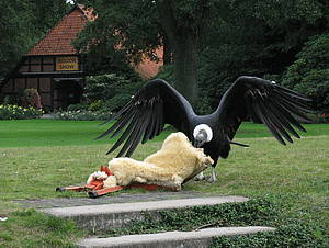 Der Vogelpark hält auch einen Condor, das ist der Vogel mit der größten Flügelspannweite auf der Welt. Er lebt normalerweise in Südamerika und ernährt sich von dem Fleisch toter Tiere, das nennt man Aas. In der Show war das tote Lama eine selbstgebastelte Puppe, wie ihr auf dem Foto seht. Es ist wirklich beeindruckend, den Condor fliegen zu sehen, er hat sich sein Fleisch dann aus der Puppe herausgeholt.