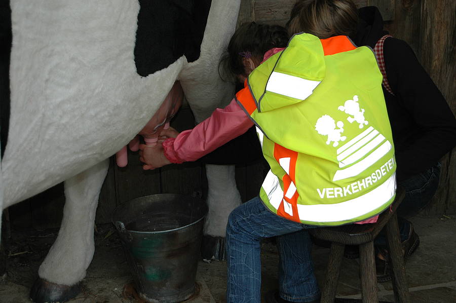 Wer soviel Spannendes gesehen hat, bekommt irgendwann Hunger. Also haben wir uns entschieden, für unser Mittagessen ins Dorf Mullewapp zu marschieren. Auf dem Weg dorthin kamen wir an Meyers Hof vorbei, wo wir schnell noch ein paar Kühe gemolken haben – das war ganz schön anstrengend. Schnell trieb uns der Hunger weiter Richtung Mullewapp. Dort angekommen stärkten wir uns bei einer leckeren Portion Pommes und ruhten uns einen Moment aus.