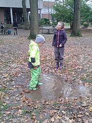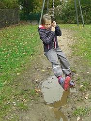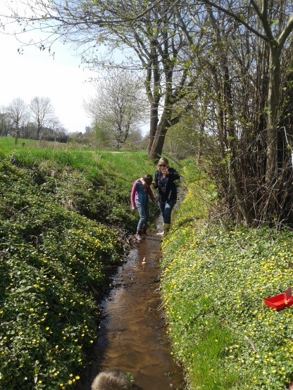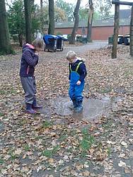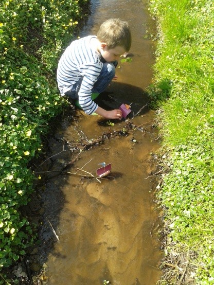 Im Frühling pflückten wir die ersten Blumen. Wir falteten Boote und ließen sie in Pfützen schwimmen. Wir sangen Wind- und Wetterlieder, ließen es uns bei einer Wettermassage gut gehen und lasen das Buch „Onkel Gustav und der Regenschirm“. Nach einem heftigen Regen bauten wir Boote und ließen sie auf der Beeke treiben.