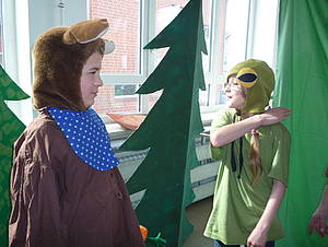 Für so ein Theaterstück sind auch die Requisiten wichtig. In den ersten Wochen haben wir mit echten Möhren gespielt, die wir in Erde gesetzt hatten. Leider hing das Möhrengrün schnell schlapp herunter und war nicht mehr zu gebrauchen. Dann haben wir Pappmaché- Möhren gebastelt. Damit sie schön schwer sind, haben wir auch Sand hineingeschüttet. Das war viel Arbeit, weil wir für das Möhrenbeet richtig viele Möhren gebraucht haben.