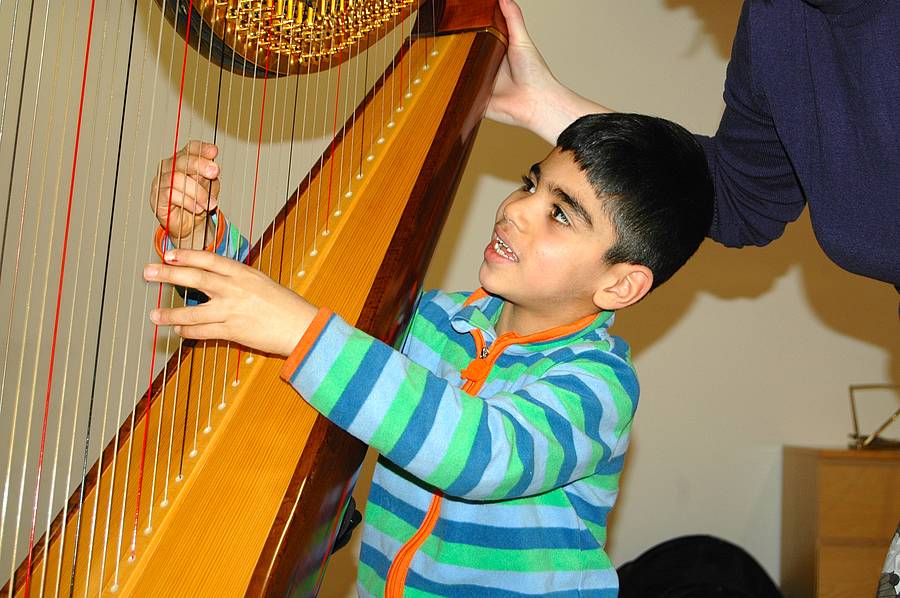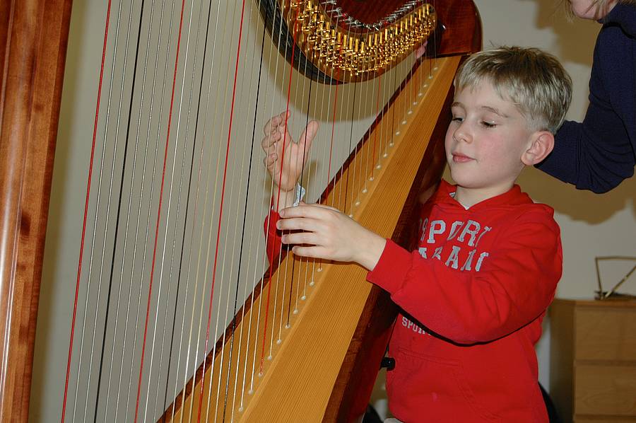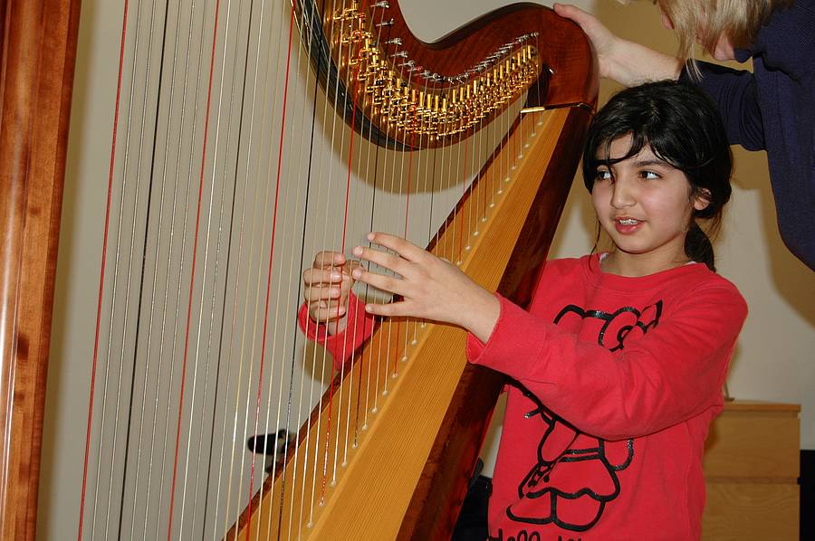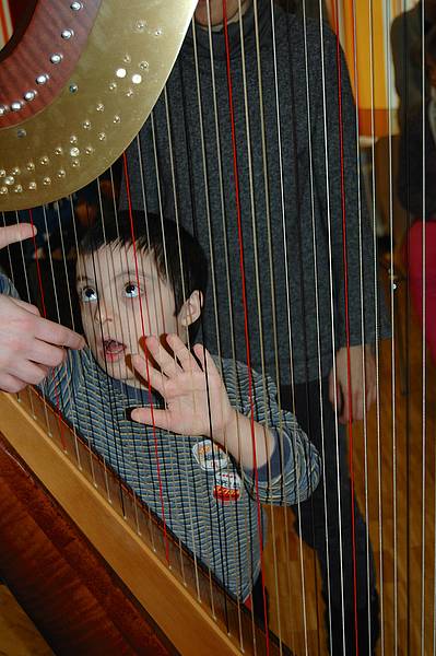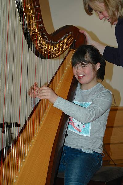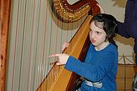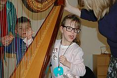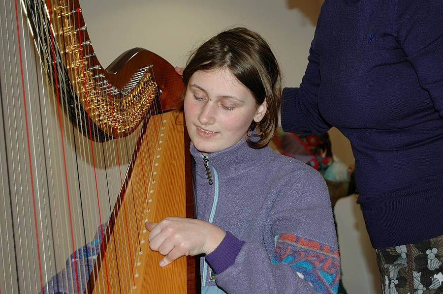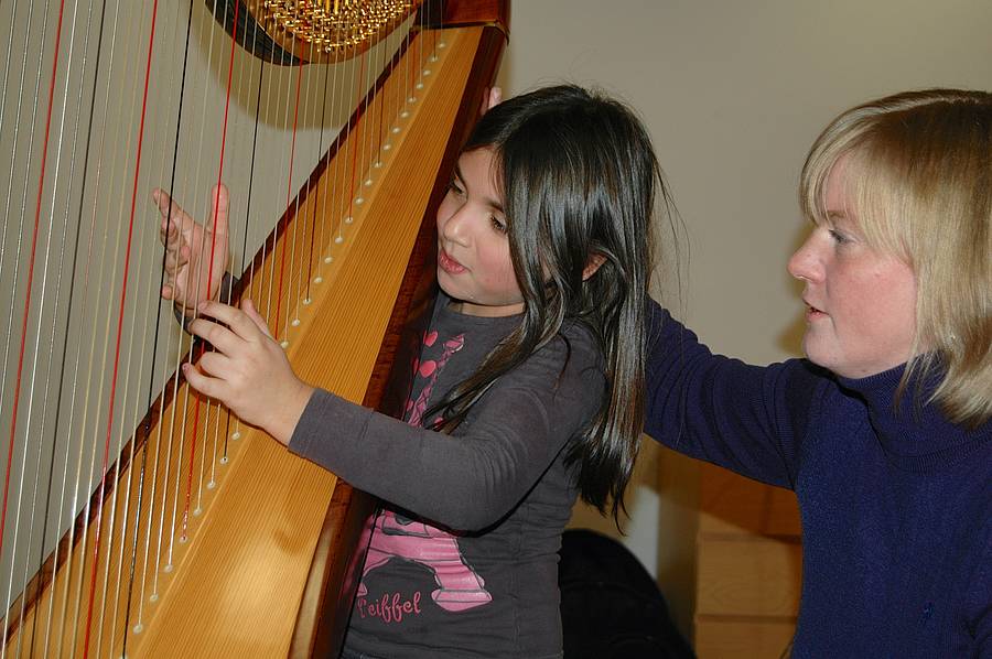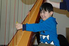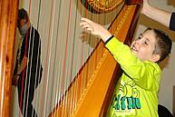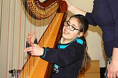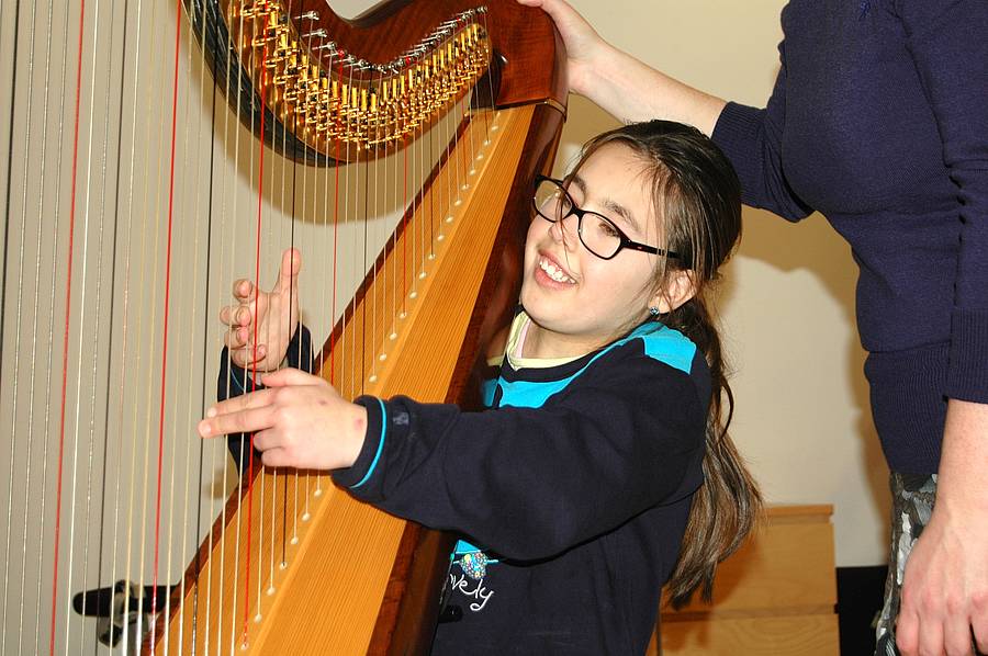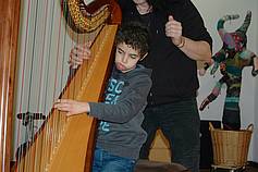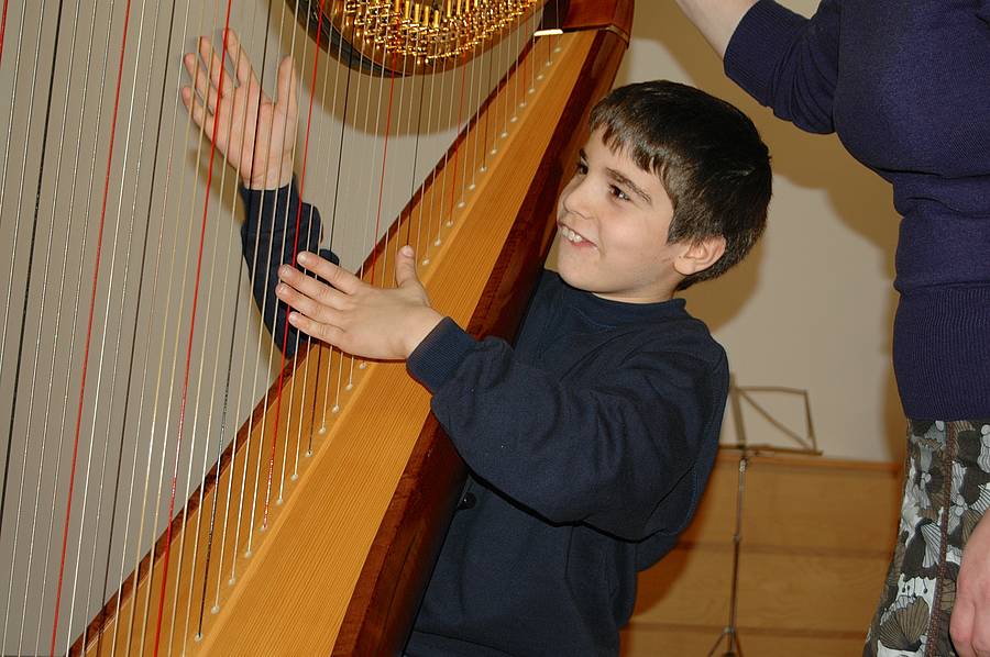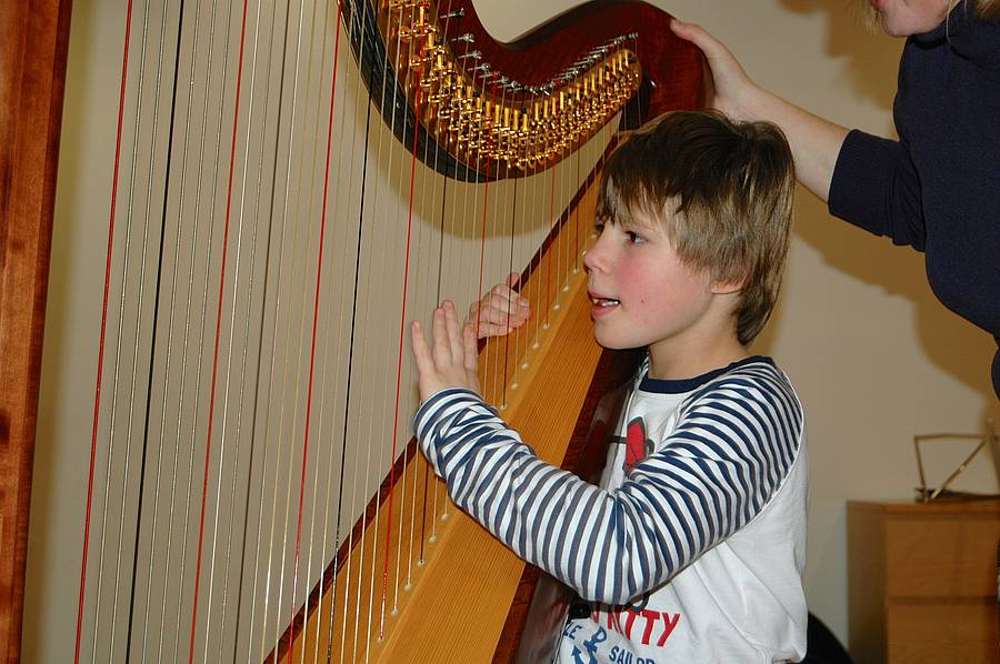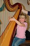 Da Frau Meyer schon zum fünften Mal bei uns war, wussten unsere SchülerInnen schon, was nach dem Vorspiel kam: sie dürfen selber auf der Harfe spielen. Fast alle unsere SchülerInnen trauten sich auch wirklich an dieses beeindruckende, große Instrument und versuchten unterschiedliche Klänge auf ihm zu erzeugen. Es hat allen viel Spaß gemacht, wie man auf den nachfolgenden Fotos erkennen kann.