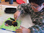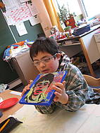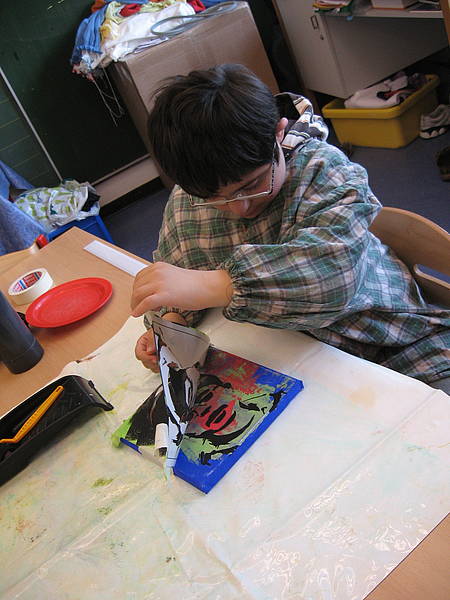 Die Kinder aus der Mäuseklasse und der Igelklasse haben die Leinwände ganz nach ihrem Geschmack gestaltet – die Technik mit den Linealen haben sie sich bei dem Maler Gerhard Richter abgeguckt. Nach einiger Übung auf Papier haben sie ihr Gesicht mit Hilfe einer (von den Erwachsenen gefertigten) Schablone auf die Leinwand gebracht.