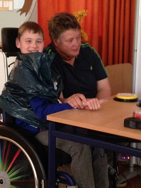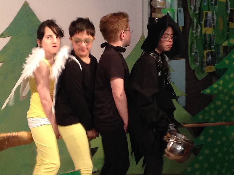 So begannen wir mit den Theaterproben, gestalteten Kostüme und das Bühnenbild. Da nicht alle Kinder in unserer Klasse sprechen können und auch das Auswendiglernen für viele schwierig ist, nutzten wir verschiedene Hilfsmittel der Unterstützen Kommunikation. Die Dialoge wurden auf Step-by-Steps, BigMäcs und GoTalks gesprochen und wir mussten sie an der richtigen Stelle im Theaterstück abspielen.