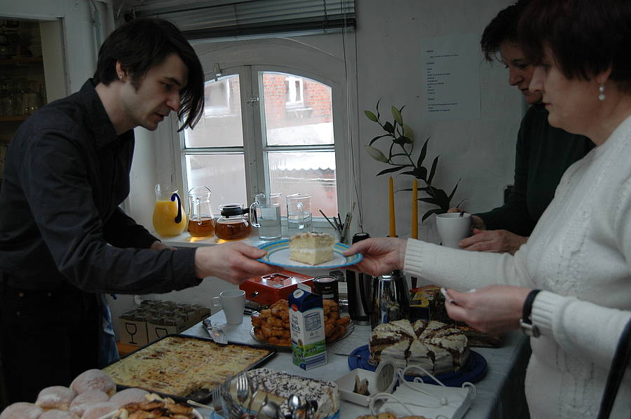 Bereits kurz vor der offiziellen Ausstellungseröffnung um 14:00 Uhr kamen die ersten Gäste, die größtenteils von Andreas persönlich begrüßt wurden, und bald schon waren die Atelierräume gut gefüllt. In einer kleinen Begrüßungsansprache berichtete Diana von ihrer Arbeit mit Andreas. Sowohl sie als auch Andreas standen den ganzen Nachmittag für Fragen zur Verfügung. Die Gäste konnten bei Kaffee und Kuchen in entspannter Atmosphäre die Bilder betrachten, vor denen immer wieder Gespräche entstanden. Bereits während der Vernissage wurde ein erstes Bild verkauft, für weitere gibt es Interessenten. Alle Bilder blieben aber natürlich für die Dauer der Ausstellung hängen.