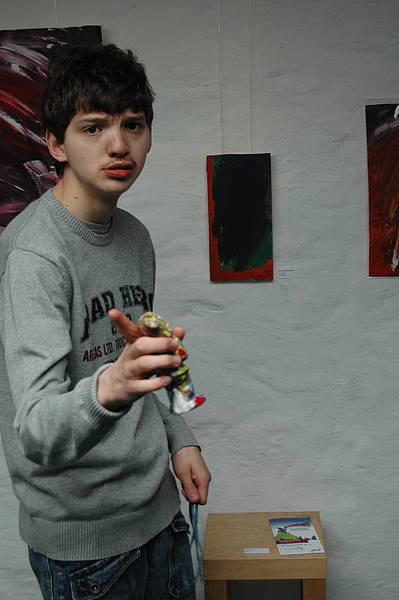 Am Samstag, den 6. März 2010, wurde in den Räumlichkeiten der Ateliergemeinschaft „KrAss UnARTig" in der Roesebeckstraße in Hannover die Ausstellung „Ein Jahr in Bewegung" eröffnet. Präsentiert wurden Bilder, die Andreas Eckel im vergangenen Jahr gemalt hat. Entstanden sind diese Arbeiten in der Schule. Während des gesamten vergangenen Jahres hat Andreas mit seiner Einzelfallhelferin Diana Lauer gemeinsam Materialien besorgt und selbstgebaute Rahmen mit Leinwand bespannt. Diese wurden dann grundiert und bemalt. Dabei sind Bilder von einer ganz eigenen Farbigkeit entstanden. Einige Bilder leuchten einem schon von weitem entgegen, während auf anderen die Farben durch ihre jeweilige Mischung gedämpft werden. In den hellen Räumen des Ateliers erfahren die Bilder eine besondere Würdigung. Für die Ausstellung wurden sie chronologisch sortiert gehängt, damit man die Entwicklung in Andreas' Malerei nachvollziehen kann.