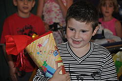 Anschließend war es endlich soweit: die Schultüten wurden von der Schulleiterin Frau Rohde an die Einschulungskinder überreicht. Dabei war bemerkenswert, dass alle Einschulungskinder den Mut hatte, alleine nach vorne zu kommen, um ihre Schultüte in Empfang zu nehmen.