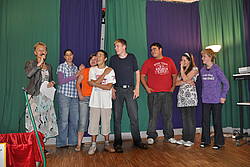 Zum Ende der Einschulungsfeier kamem mit Keder, Mareike, Avni, Phillip, Ruben, Svenja sowie Stefanie Schülerinnen und Schüler der höheren Jahrgänge nach vorne.