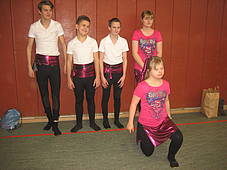 Zu Beginn der Veranstaltung bekamen wir einen riesigen Schreck, weil kurzfristig zwei Schülerinnen abgesagt hatten. Wir hätten keine Startgenehmigung erhalten (Mindestanzahl pro Gruppe = 6 Voltigierer), wenn nicht freundlicher Weise JULIA, eine 20-jährige Helferin, eingesprungen wäre. Iris stellte ruck-zuck die Kür etwas um und alle strengten sich super an und gaben ihr Bestes. Dafür ein ganz, ganz dickes Lob!!!