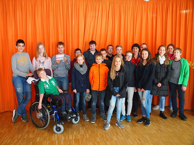 Gemeinsam mit ihrer Lehrerin Frau Graalfs entschieden die Schülerinnen und Schüler, dass sie den Gewinn spenden möchten und kamen deshalb in unsere Schule. Die Spende wurde freudig von der Abschlussstufe entgegengenommen. Mit dem Geld werden Materialien zur „Unterstützten Kommunikation“ für Schülerinnen und Schüler unserer Schule erworben.