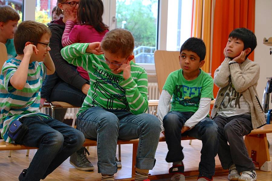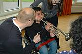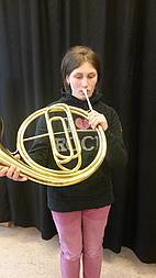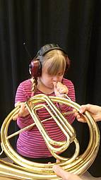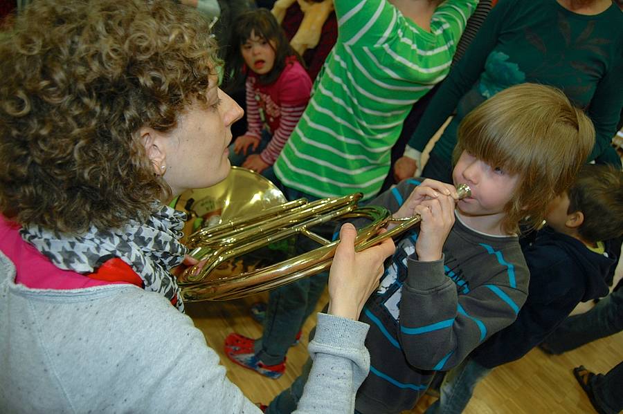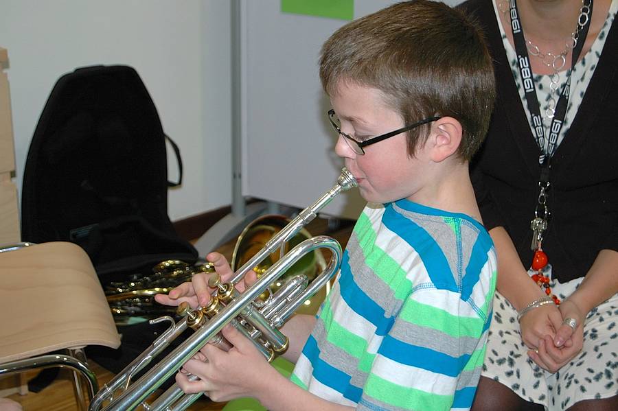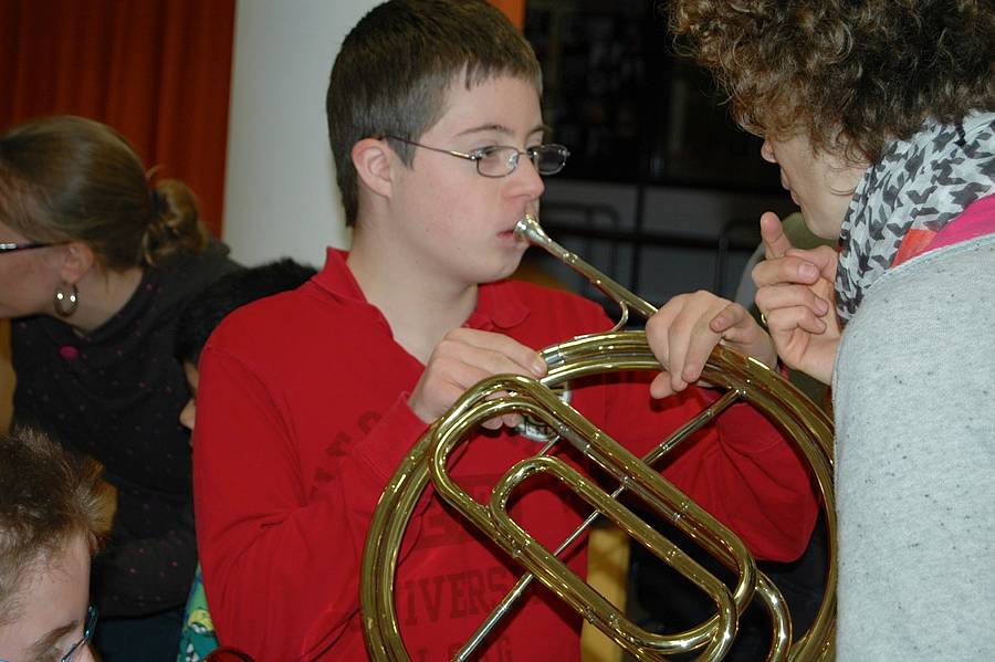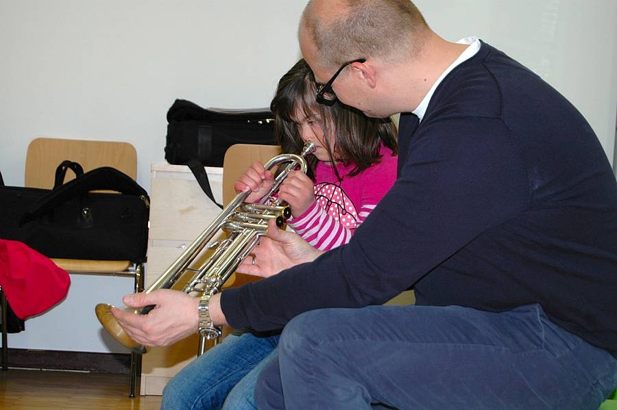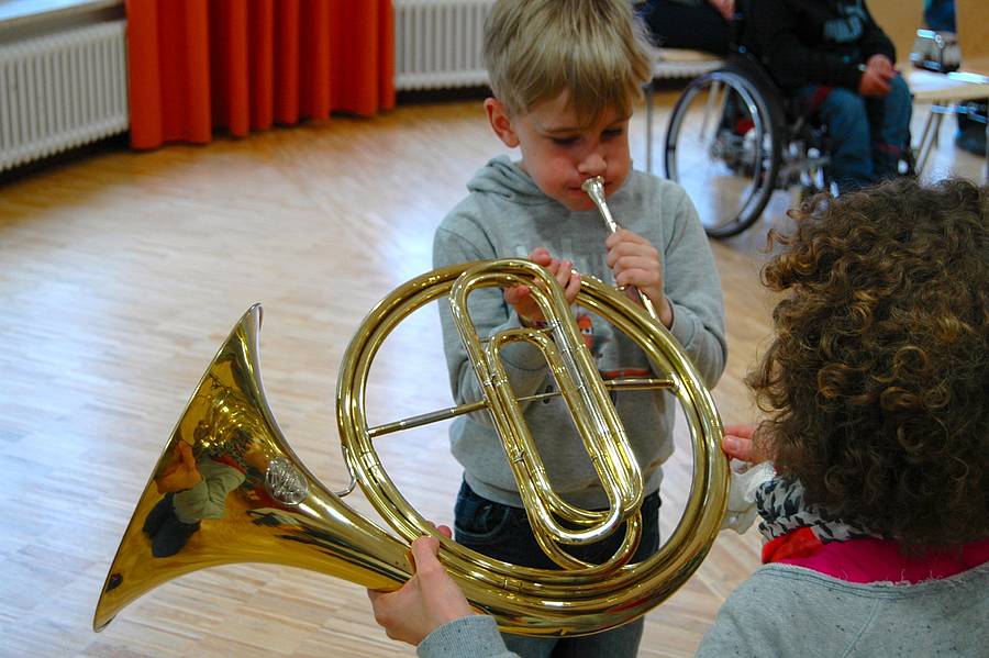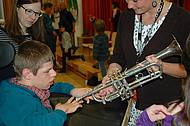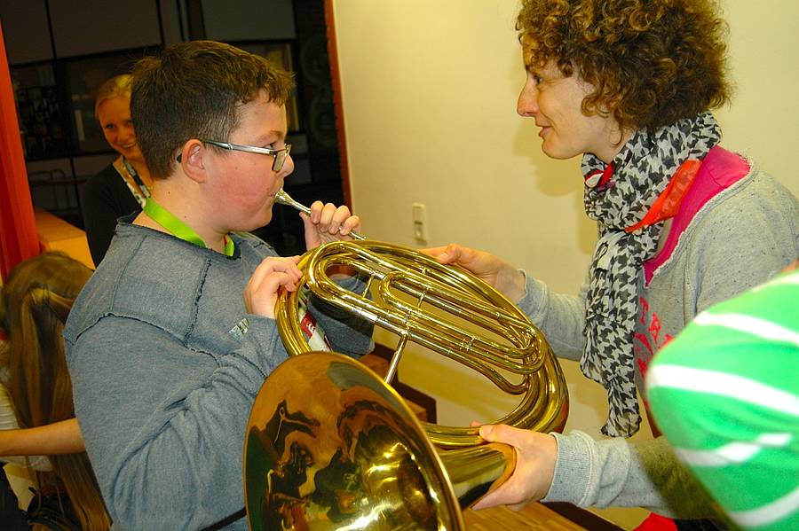Alicia war die erste, die sich in der praktischen Phase an die Trompete getraut hat. So war das Eis gebrochen und die anderen wollten auch spielen. Luca und Leon P. erzeugten als erste Töne, später klappte es auch noch bei einigen anderen. Jan-Luca zeigte sichtliche Begeisterung am Geschehen und Shirihan fiel vor lauter Freude der Hornistin um den Hals.
