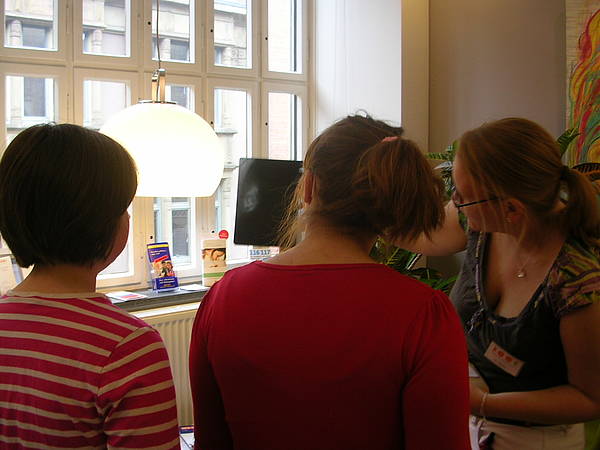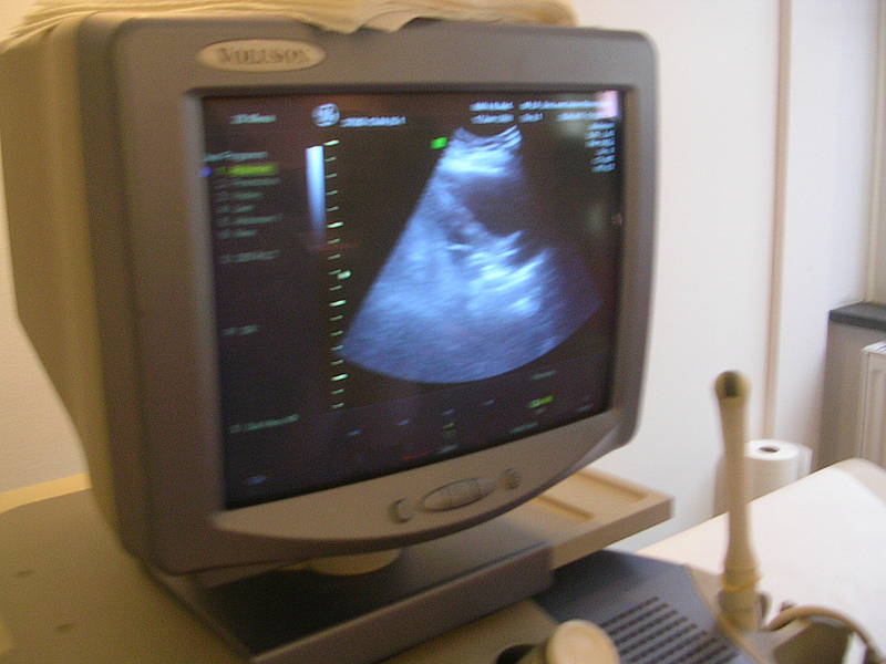 An jeder Tür steht, was dahinter gemacht wird, z.B. Sprechzimmer 1. Dort wird mit dem Arzt oder der Ärztin gesprochen. Nach dem Mammographie-Raum zeigt uns Frau Menke einen Raum, wo CTG an der Tür stand. Dort können schwangere Frauen die Herztöne ihrer ungeborenen Babys hören. Nicole hat gleich Platz genommen und Frau Menke zeigte ihr, wo die Kabel hingehören. In dem gemütlichen Raum hängen auch ganz viele Fotos von den Babys und ihren Eltern, die von der Praxis betreut wurden. Dann haben wir bei Frau Dr. Amend im Büro gesessen und uns über Menstruation, Binden, Tampons, Regelschmerzen, Bauchschmerzen, Geschlechtsverkehr und Verhütung unterhalten. Dr. Amend zeigte uns nochmal, wie ein Tampon benutzt wird und dann sind wir in den Untersuchungsraum gegangen. Dort stand ein Untersuchungsstuhl, auf den sich nur Nicole getraut hat. Dr. Amend erklärte uns dann, wie eine Untersuchung bei einem Mädchen oder Frau gemacht wird. Zum Schluß hat Nicole dann noch ein Ultraschallbild von ihrer Blase (da waren ca. 40ml Flüssigkeit drinnen!) und ihrem Herz bekommen. Das war alles ganz klasse - aber auch richtig viel Wissen!