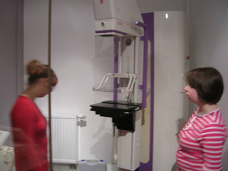 Wir durften erstmal im Wartezimmer unsere Jacken aufhängen und etwas Wasser trinken, das dort stand. Dann hat uns Frau Menke, eine der Sprechstundenhilfen, durch die Praxis geführt. Als erstes haben wir gesehen, wo sich alle Mitarbeiter umziehen können und wo sie sich einen Tee machen können. Dann waren wir in einem Raum, wo ältere Frauen ihren Busen untersuchen lassen müssen, der komisch zwischen zwei Platten eingequetscht wird. Das nennt sich Mammographie. Frau Menke hat uns dazu noch ein Bild von einer Brustaufnahme gezeigt.