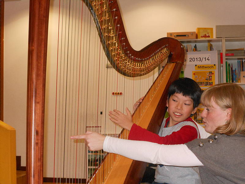 Im Anschluss daran hatten die Schülerinnen und Schüler aller Altersstufen die Möglichkeit, in Workshop-Atmosphäre das gar nicht so einfache Spiel auf den Saiten der großen Konzertharfe auszuprobieren. „Ich bin wieder positiv überrascht davon, wie fasziniert und aufmerksam die Kinder auf das Harfenspiel reagiert haben “, sagte die Musiklehrerin und in verschiedenen Ensembles konzertierende Harfenistin Meyer später im Gespräch. „Zu Beginn war es ja etwas wuselig und lebhaft, aber kaum erklangen die ersten Harfenakkorde, so wurden alle still und aufmerksam. Ich finde es erstaunlich, wie mutig und vertrauensvoll die Kinder auf mich und die beeindruckend große Harfe zugehen und voll Neugier das Instrument kennen lernen wollen. Sicherlich trägt auch die gemütliche Atmosphäre hier im Forum dazu bei “, äußerte Frau Meyer zum Abschluss des einstündigen Harfenworkshops. Die Schulleiterin Frau Maike Rohde freute sich natürlich über diese Rückmeldung und lud Frau Meyer gerne zu einer Fortsetzung ihrer musikalischen Besuche ein.