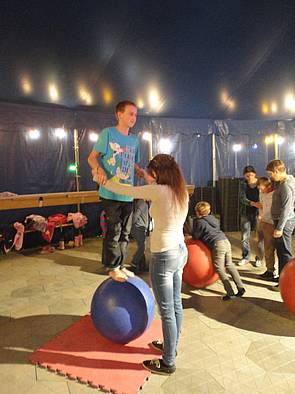 Simon erzählt: " Ich habe auf einer großen Kugel balanciert. Ich hatte Hilfe von einem netten Mädchen, die war sehr hübsch."