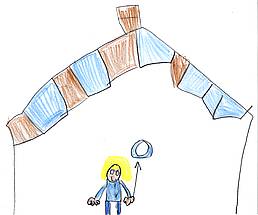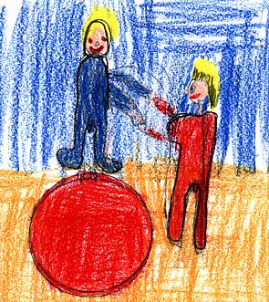 Simon und Patrick haben sich auch auf das Nagelbrett getraut, wie ihr auf den Fotos seht. Im Zirkuszelt konnte man auch mit Tellern und Ringen jonglieren üben. Patrick und Simon konnten einen Teller, der sich dreht, auf einem Stab balancieren. Jakob hatte viel Freude daran, Ringen auf seinen Armen kreisen zu lassen. Die Zeichnung ist von Jennyca. Sie hat sich selbst gemalt, wie sie im Zirkuszelt mit einem Ring jongliert.
