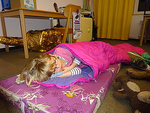Zuerst haben wir die Betten gemacht. So viele Matten, Matratzen, Schlafsäcke, Kissen und Bettzeug haben alle mitgebracht. Auf den Fotos seht ihr Nancy und Joshi, die schon mal Probe liegen. Toll, so ein Schlafsack!