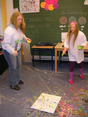 Die Klasse Berenji hat sich einige Wochen lang mit der Kunst von Jackson Pollock beschäftigt. Jackson Pollock hat die Farbe oft mit der Technik des "Dripping" (deutsch: Tropfen) auf sine Leinwände gebracht. Dadurch entstehen fantasievolle und kreative Bilder.