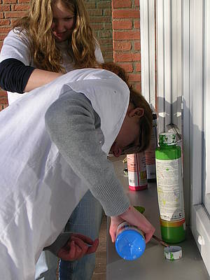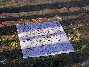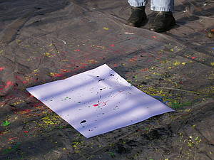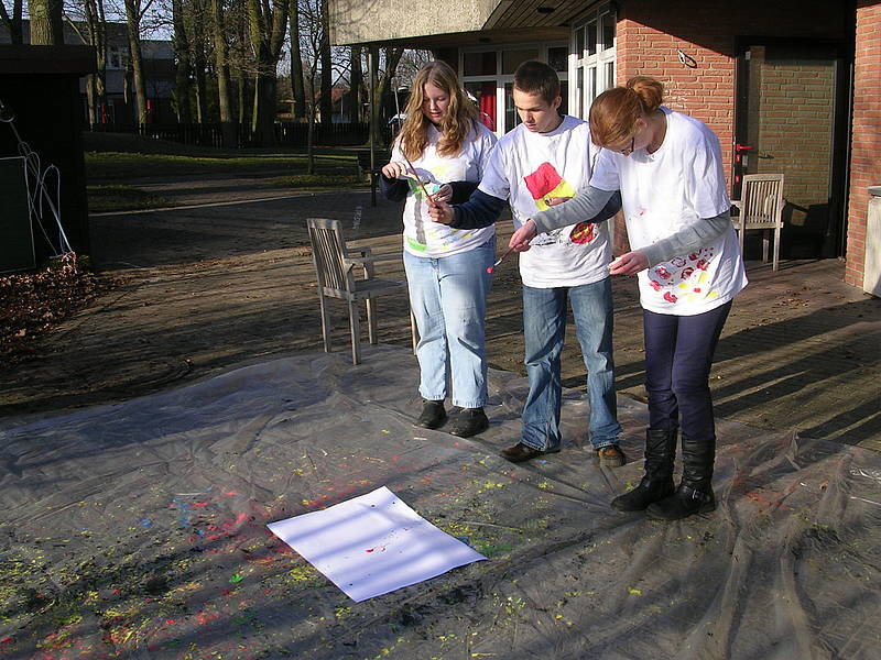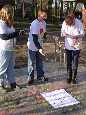 Diese Technik haben wir erstmal auf Papier in Einzelarbeit geübt, geübt, geübt! Man muss ja vieles beachten - Unterlage benutzen, Malkittel anziehen, nicht zu stark spritzen, mit den anderen angemessen sprechen, aufräumen - Schließlich war es soweit, dass wir ein gemeinsames Bild gestalten wollten. Die Generalprobe fand mit einem großen Papier draußen statt. Es musste abgesprochen werden, wer wo steht, wer welche Farbe benutzt und in welche Richtung gearbeitet wird. Kommunikation und Rücksichtnahme waren hier Bestandteil unserer Arbeit. Das Miteinander hat super geklappt, so dass Fr. Berenji in Ruhe die Fotos machen konnte.