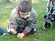 Eines Tages entdeckte Marie in der Waldschlucht ein großes „Lehm-vorkommen“. Sie sammelte den Lehm und formte daraus große Kugeln. Dies regte unsere Phantasie an, und wir begannen „Matschmonster“ zu bauen. Jannik lauschte und beobachte interessiert das Getummel, das sich vor ihm auf dem Boden bot: