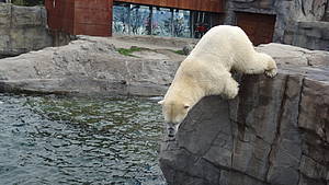 Toll, wie der Eisbär ins Wasser springen kann! Von Fenstern unter Wasser konnten wir sehen, wie der Eisbär schwimmt und sich seine Fleischstücke holt. Im Foto unten rechts seht ihr, wie Felix den Eisbär streichelt.