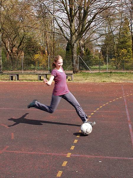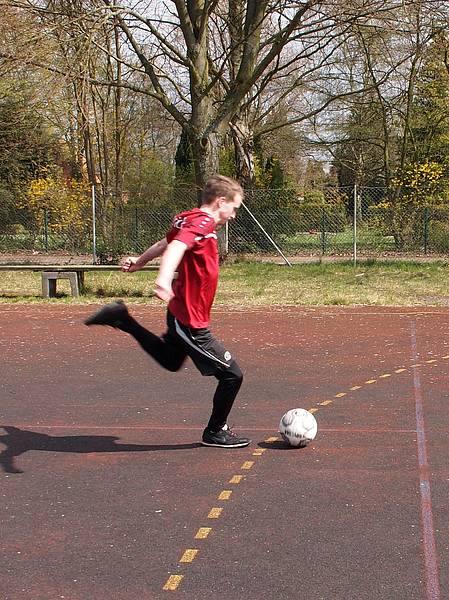 Jeden Dienstag hallten die gleichen Worte durch unser Forum: „Packt bitte die Bälle ein und denkt an die Ballpumpe!“ 11 Schülerinnen und Schüler nahmen ihre Sportsachen und machten sich auf den Weg zum Fußballtraining. Wie in den letzten Jahren leitete Herr Ruddat das Training. Unterstützt wurde er dabei von seiner Co-Trainerin Frau Neumann, welche neu im Team war und sich besonders im Bereich Teammanagement hervor tat. So war es uns möglich ein Bundesligaspiel von Hannover 96 zu besuchen und neue Schienbeinschoner und Bälle zu erwerben. Das Training begann immer mit ein paar Runden Warmlaufen und anschließendem Dehnen. Die alten Hasen im Team unterstützten dabei die jüngeren Spieler und brachten regelmäßig neue Dehnübungen ein und stellten diese vor. Das Wichtigste für alle war natürlich das Spiel mit dem Ball. Bevor es jedoch zu einem Trainingsspiel kommen konnte, machte die Mannschaft Passübungen und trainierte den Torabschluss.