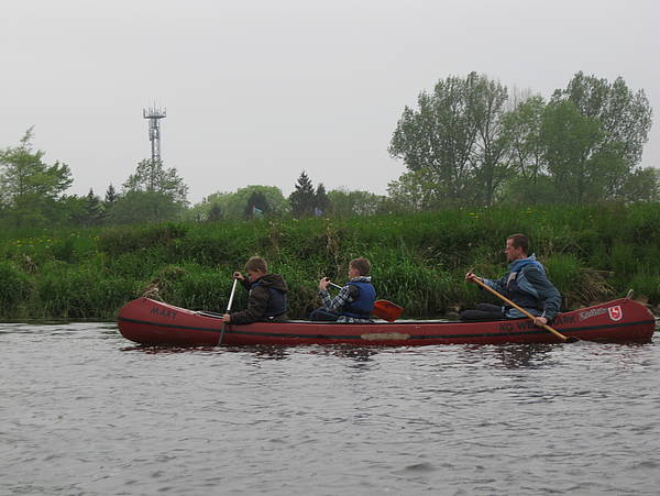 Jeden Donnerstag nach dem Mittagessen treffen wir uns mit 12 Schülern und zwei Lehrern. Dann werden die Kajaks, das sind kleine leichte einsitzige Boote, und ein viersitziger Kanadier auf einen großen Bootsanhänger geladen und hinter den Bus der Berthold-Otto-Schule gehängt. Wir sind bis Winsen an die Aller gefahren und haben dort die Boote vom Hänger aufs Wasser gebracht. Zum Eingewöhnen fahren Simon, Patrick und Peter erst einmal zu dritt in einem Kanadier, der aussieht wie ein Kanu in einem Indianerfilm. Die anderen Jugendlichen fahren Kajaks. Dafür müssen sie eine Spritzdecke anziehen, die dann über die Einstiegsöffnung gespannt wird, damit kein Wasser ins Boot läuft. Die Spritzdecken sehen an Land wie komische Schürzen aus. Unsere Wertsachen und trockene Anziehsachen kommen in einen Kentersack, der wasserdicht verschlossen ist, damit wir im Falle eines Falles immer noch etwas Trockenes zum Anziehen haben. Dann geht es los.