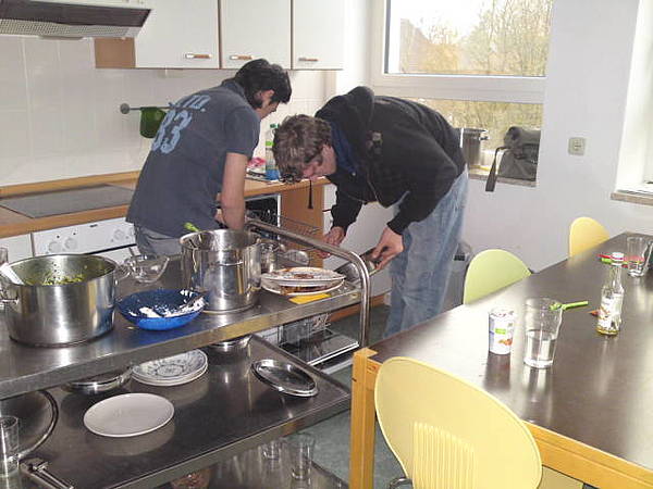 Steffi hat eine Käse-Sahnesoße mit Kochschinken gekocht, Svenja hat eine Sahnesoße mit Erbsen und Schinken gemacht, Keder kochte Schokopudding, Miguel hat Sahne geschlagen, Mareike hat Vanillinsoße gemacht, Marvin und Avni kochten Spaghetti mit Spinat und Kevin und Marcel haben Crepes gekocht und gebraten.