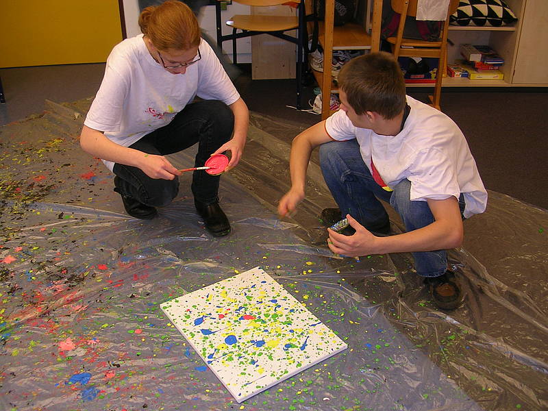 Die Klasse Berenji hat sich einige Wochen lang mit der Kunst von Jackson Pollock beschäftigt. Jackson Pollock hat die Farbe oft mit der Technik des "Dripping" (deutsch: Tropfen) auf sine Leinwände gebracht. Dadurch entstehen fantasievolle und kreative Bilder.