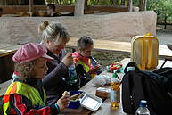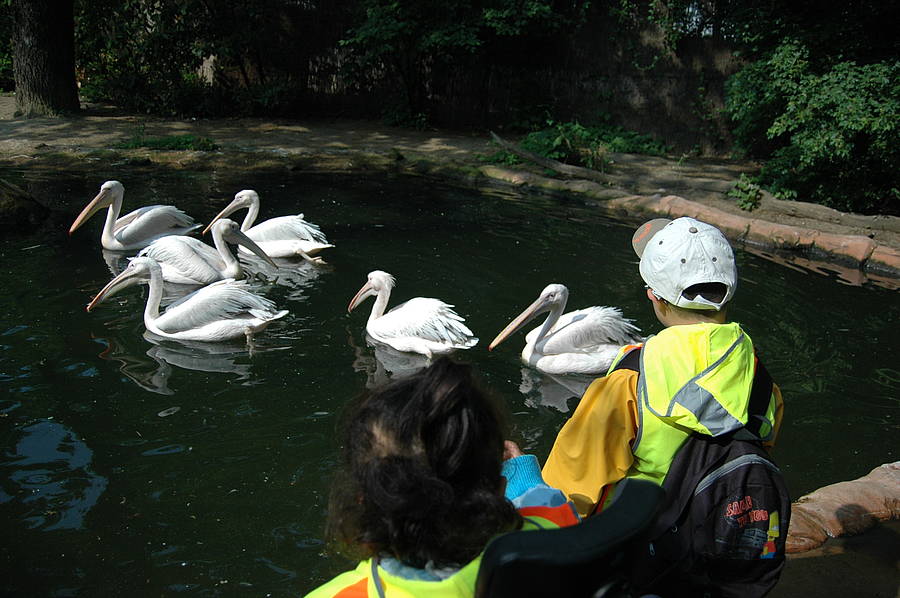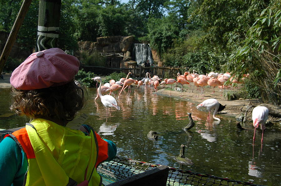 Als allererstes wollten wir Frühstücken. Aber auf dem Weg zu unserem Frühstücksplatz sind wir schon an vielen Tieren vorbei gekommen: den Pelikanen (bei denen man sogar ins Gehege hinein durfte), den Flamingos, den Zebras und Antilopen und den dicken Flusspferden. Wir mussten also immer wieder stehen bleiben und gucken.