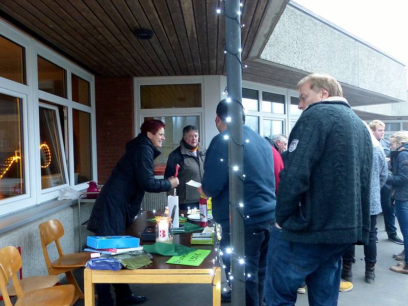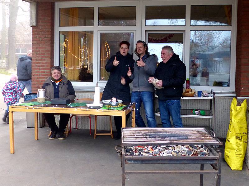 Und in der Zwischenzeit gab es für die weniger kuchenbegeisterten Besucher draußen leckere Bratwürstchen. Wer nur mal frische Luft schnappen wollte und es trotzdem vorzog, warme Füße behalten zu wollen, durfte sich an der Feuertonne einfinden zum Klönen, gemeinsamen Essen... Dazu konnte man dann noch ein Gläschen „Traumpunsch“ genießen.