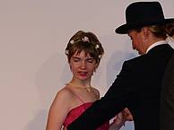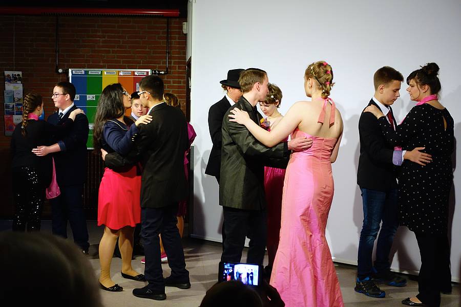 Um 16 Uhr führte uns die Abschlussstufe die ersten Ergebnisse der „schuleigenen“ Tanzschule vor: In tollen Roben baten die Schüler zum Tanz. Spitze!!! Großartig begleitete Melanie Arlt diese Vorführung gesanglich.