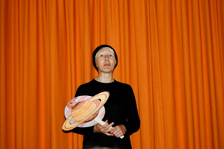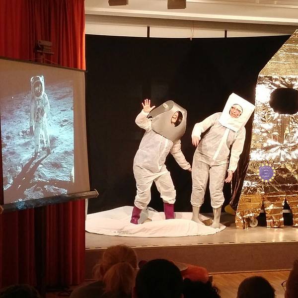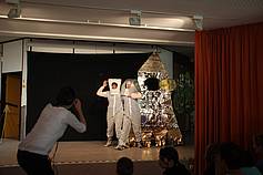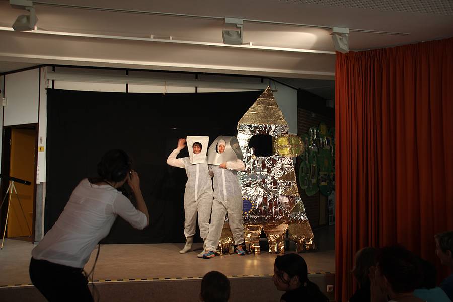Die Schüler und Schülerinnen wussten schon aus den letzten Jahren, dass in der Projektwoche die Tage immer mit Theater und Gesang anfangen. Dieses Jahr wurde das Lied „Auf meinem Raumschiff, da bin ich Kapitän“ gesungen. Auf der Bühne sind Saja und Dex tatsächlich ins Weltall geflogen...