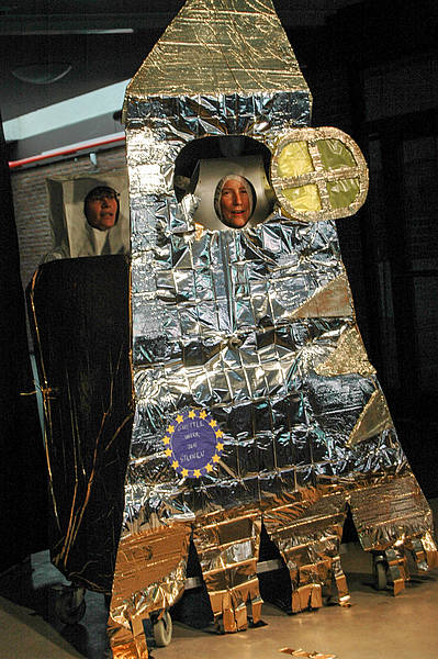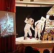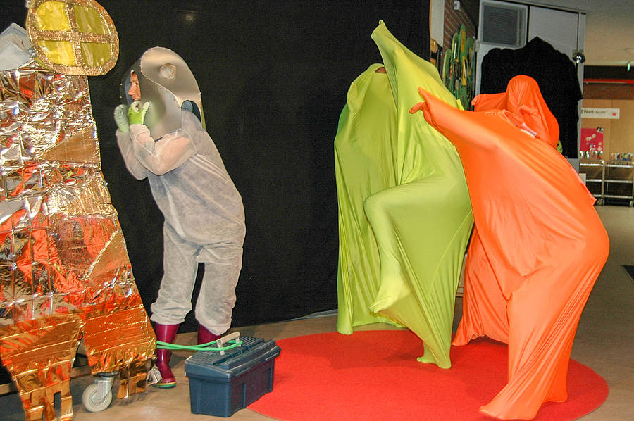 Dienstag geht bei Saja und Dex die Reise tatsächlich los. Erstmal berichten sie aber noch von ihrem Astronautentraining und haben auch ein paar Übungen für das Publikum mitgebracht. Dann werden die Raumanzüge angelegt und – nach einem schnellen Erinnerungsfoto – die Rakete bestiegen. Der Commander der Basisstation gibt den Countdown – und los geht die Reise!