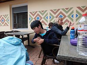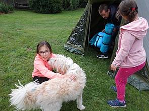 Am 13.06.2018 trafen wir uns morgens in der Schule. Dort haben wir zuerst gefrühstückt. Dann haben wir all unsere Sachen in Ulrikes und Sophias Auto gepackt und sind zu Sophia gefahren. Die Hunde haben uns freudig begrüßt. Mija, Wanda, Leonora und Sophia sind mit den Hunden spazieren gegangen. Die anderen haben mit Peter die Zelte aufgebaut.
