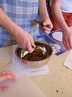 Die Cornflakes und die Mandelstifte zur flüssigen Schokolade geben und alles verrühren.