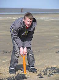 In Cuxhaven gibt es einen schmalen Sandstrand zur Nordsee. Dahinter liegt ein großes flaches Wattenmeer, dass sich bis zu der Insel Neuwerk erstreckt. Das Wattenmeer ist ein Meeresboden, der bei Niedrigwasser trocken fällt und regelmäßig überflutet wird. Hier leben viele Tiere, sie sich diesen Lebensbedingungen angepasst haben. Am Dienstag sind wir gemeinsam mit einer Wattführerin im Wattenmeer gewandert. Wie gut, dass wir alle Gummistiefel dabei hatten! Für Siana konnten wir einen Wattrollstuhl ausleihen. Das ist ein riesiges Gefährt, das große Gummireifen hat und dadurch nicht einsinkt. Siana war auch begeistert und hat es genossen, gefahren zu werden. Auf dem zweiten Foto sehr ihr Simon, der es gerade geschafft hat, einen Wattwurm mit einer Mistgabel auszugraben.