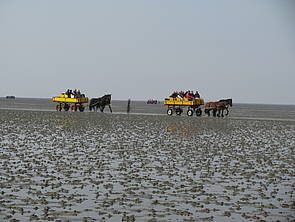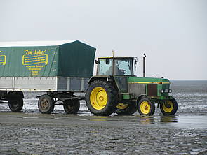 Im Watt zwischen dem Stadtteil Sahlenburg und der Insel Neuwerk gibt es viel Verkehr. Wir haben Trecker und Wattwagen gesehen, die bei Ebbe Ausflügler, Nahrungsmittel und Gepäck zur Insel bringen.