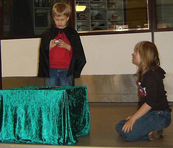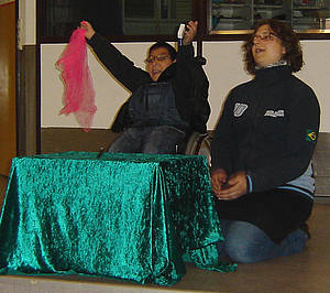 Eifrig üben die Zauberer-Lehrlinge Onur, Marc, Annalena, Sandra, Dennis, Ismail, Leon und Pascal leere Streichholzschachteln voll zu zaubern, Strohhalme zu vermehren, überraschende Dinge erscheinen zu lassen, oder.... – Aber alles soll hier nicht verraten werden!