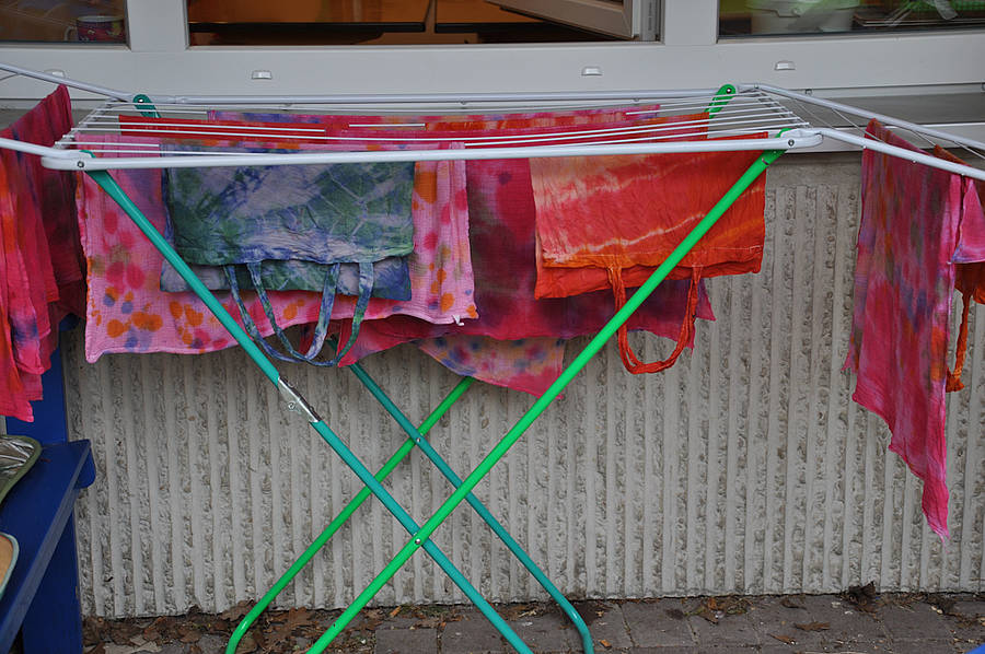 An einem Tag in der Woche durfte sich jeder Schüler eine Tasche mit der Batik-Technik farbig gestalten. Es wurde gewickelt und  geknotet oder Schraubzwingen oder Klammern wurden an den Taschen befestigt. Nach dem Tauchbad in der Farbe wurde es jedes Mal spannend: Wie ist das Muster wohl geworden? Welche Farben sind dieses Mal entstanden? Jede Tasche ist einzigartig geworden.