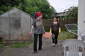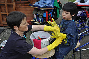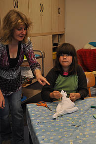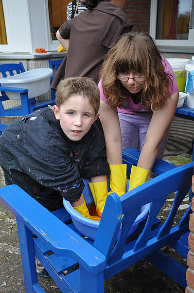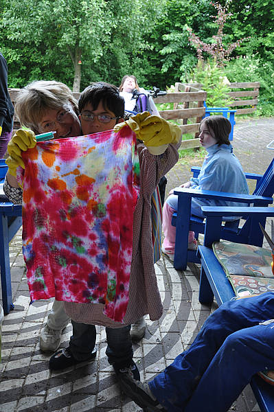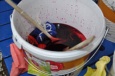 Wer noch Zeit und Lust hatte, nutzte die Gelegenheit, die langweiligen weißen Windeln der Schule mit bunten Farben einzufärben. Einfach Farben auf die Tücher spritzen, bis nichts Weißes mehr zu sehen ist, fertig!