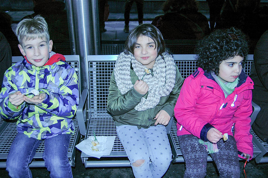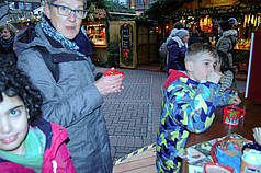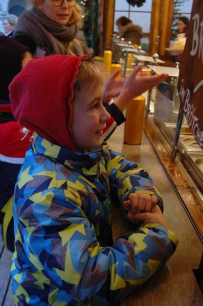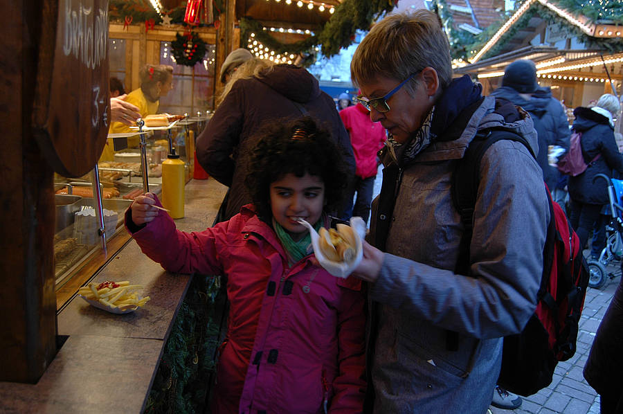 Dann sind wir rausgegangen aus der Kirche und haben auf dem Weihnachtsmarkt was gegessen. Wir durften es uns selber aussuchen. Danach haben wir Kinderpunsch oder Kakao getrunken. Dann durften wir Karussel fahren. Sayina und ich waren im kleinen Riesenrad, Emine war in einem Karussel mit Pferden und Kutschen. Dann sind wir zurück zum Bahnhof gegangen und haben dort noch Poffertjes gekauft.
