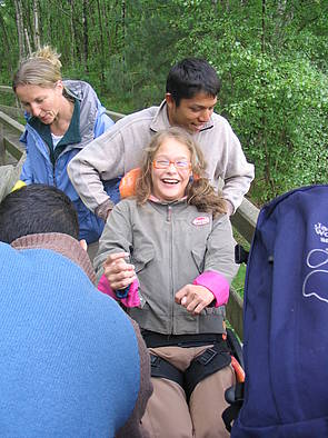 - Arsim schiebt Sarah auf einem Bohlenweg