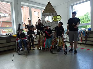 Am zweiten Projekttag landete die Rakete auf einem Planeten, der von Robotern besiedelt war. Diese bewegten sich ganz komisch: zackig, wie eine Maschine. Wir verkleideten uns als Roboter.