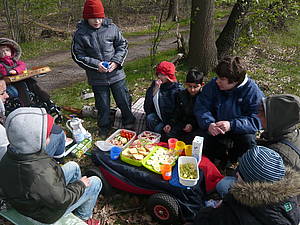 Obwohl sich das Wetter nicht so ganz entscheiden konnte zwischen Sonne und Regen, sind wir trocken zu unserem Picknickplatz im Wald gelangt. Das war auch gut so, denn unsere Regenjacken lagen noch im Bus. Man kann nicht an alles denken, und so ein bisschen Regen kann uns doch nicht erschüttern! Eigentlich war es auch eher „kalt als regnerisch“. Auf einer sonnigen Lichtung konnten wir unseren „Bärenhunger“ stillen, mit Bollerwagentisch und Waldsofa. Gestärkt machten wir uns dann auf die letzten eineinhalb Kilometer. In Gailhof angekommen war die Freude groß: Koffer auspacken, Betten beziehen und erst einmal Probeliegen.