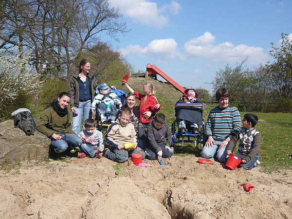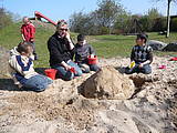 Viele Baumeister machten sich im Sandkasten an die Arbeit. Als das Werk beendet war, konnte man eine große Burg mit Burggraben und viele kleine Nebenburgen bewundern. Mit Apfelschorle und Kinderschokolade wurde das „Richtfest“ gefeiert!