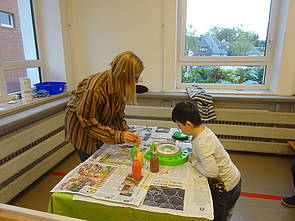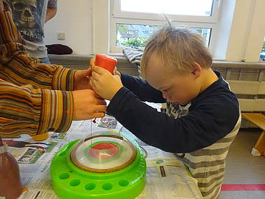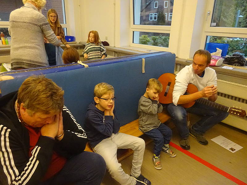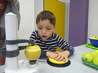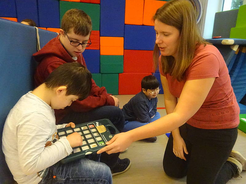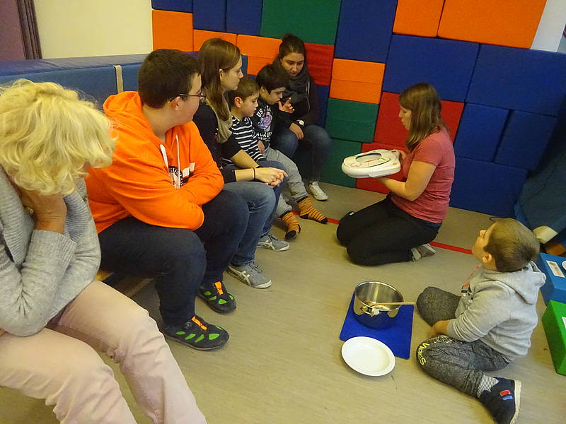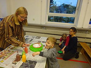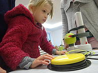 An der Musikstation durfte sich jedes Kind mit dem Storyboard eine Strophe vom Lied „Kleine Igel“ aussuchen. Die Geräusche zu Regen, Donner und Schnee waren auf dem Storyboard gespeichert. Auf dem Foto seht ihr wie Shalia auf die Taste drückt und zuhört. Zum Lied wurde fleißig mit gebärdet und gesungen.