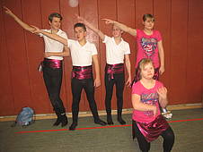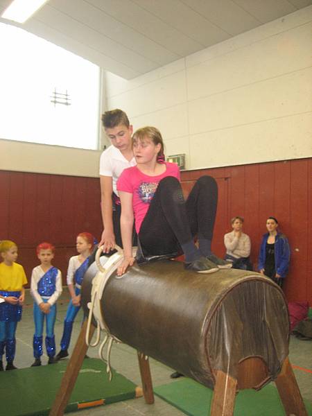 Zu Beginn der Veranstaltung bekamen wir einen riesigen Schreck, weil kurzfristig zwei Schülerinnen abgesagt hatten. Wir hätten keine Startgenehmigung erhalten (Mindestanzahl pro Gruppe = 6 Voltigierer), wenn nicht freundlicher Weise JULIA, eine 20-jährige Helferin, eingesprungen wäre. Iris stellte ruck-zuck die Kür etwas um und alle strengten sich super an und gaben ihr Bestes. Dafür ein ganz, ganz dickes Lob!!!